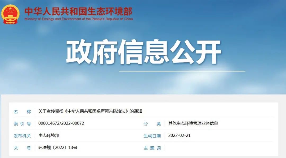 一 关于宣传贯彻《中华人民共和国噪音污染防治法》的通知 2022年2月21日中华人民共和国生态环境部发布关于宣传贯彻《中华人民共和国噪声污染防治法》的通知。 二 新旧版《中华人民共和国噪音污染防治法》