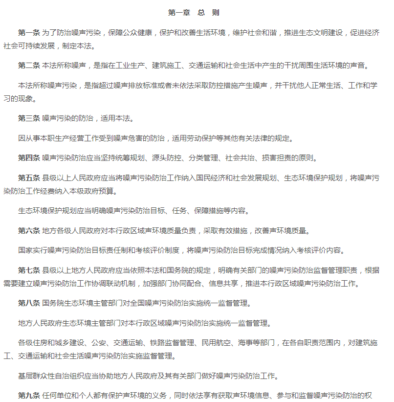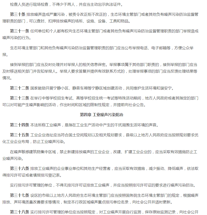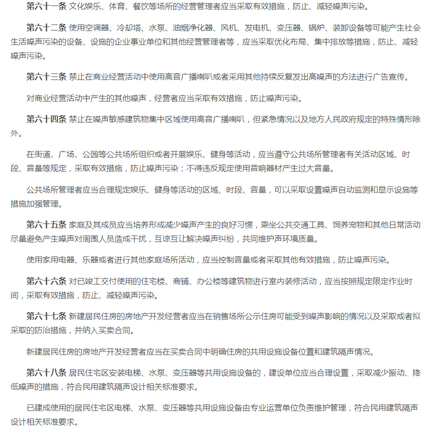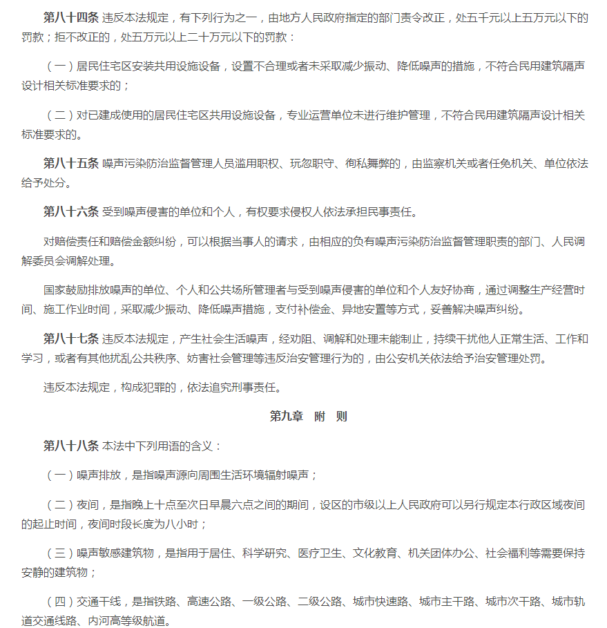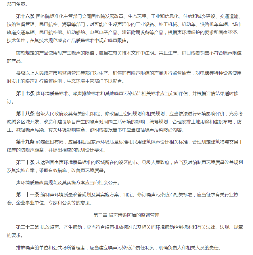 一、2021版《中华人民共和国噪音污染防治法》 原有法规的第十五条至第十七条、第十九至第二十条、第二十三条至第二十四条、第二十六条、第二十八至第二十九条等内容。 二、2021版《中华人民共和国噪音污染防治法》 (一)新版对第一条至第五条略微调整噪声音排放及防范措施标准。对噪声源头管控、分类管理、社会共治、损害担责的原则。将噪音污染防护纳入工作经费及本级政府预算。 (二)新版对第六条至第十条调整了噪音污染的考核标准。相关单位对噪声污染应实施统一监督管理。有关部门做好噪音污染的防治教育普及工作。 (三)新版对第十一至第十五条新增调整了国家鼓励对噪音防治人才及专业的培养,促进行业技术发展。对于在防治噪音实际工作中有明显成绩的单位及个人将给予表彰、奖励。各部门要做好噪音体系建设,各部门之间要做好衔接工作。 (四)新版法规第十六条至第十八条中有明确说明,对噪音限值还规定到要将相关数据写入技术文件注明。 (五)新增法规中的第二十条至第二十四条、第二十六条中对于当地政府在噪音防治工作上要及时编制声环境质量报告改善规划并实施方案,并将方案向社会公开。当地政府要加强敏感建筑物周边环境噪音排放情况的调查、监测工作。要对新建、扩建、改建可能污染环境的项目进行环境影响评价。 (六)新增法规条款第二十八条、第三十条至第三十条中,明确到对于群众反映的噪声污染问题,政府生态部门要对相关责任人进行约谈,并采取有效措施进行整改,并应向社会进行公布。 (七)新增及调整对第七十一条至第八十七条中的处罚规则。 (八)新增法规中第八十八条至第八十九条对于噪音列用含义的调整。