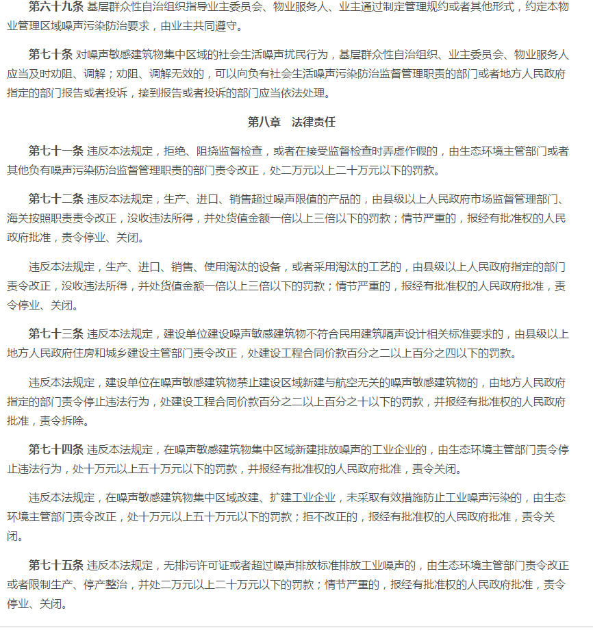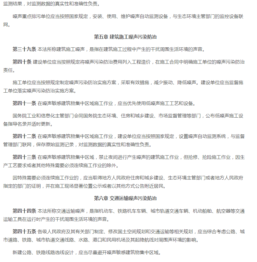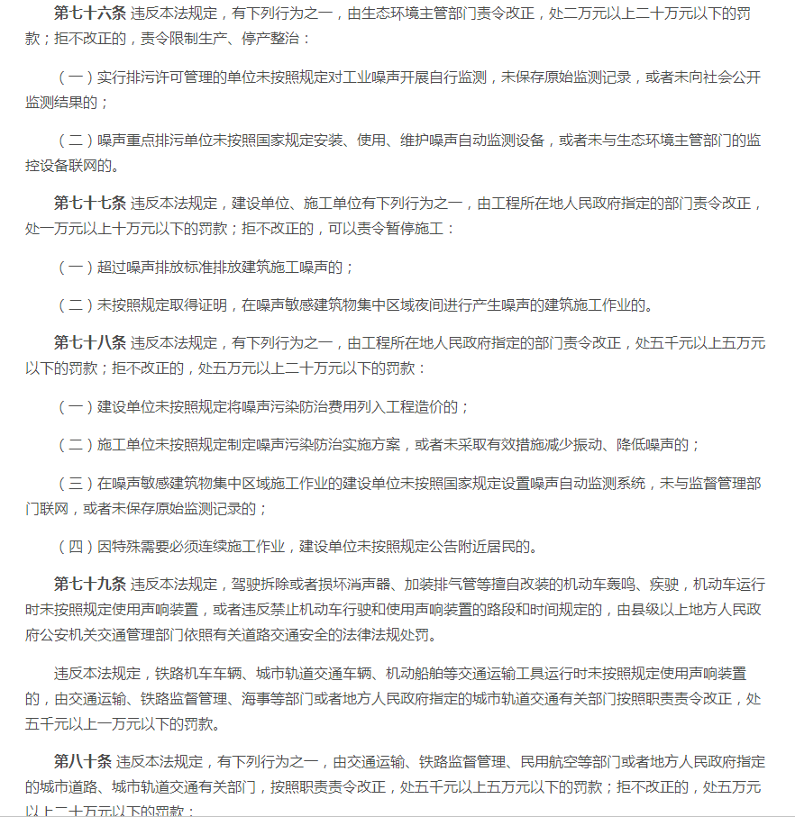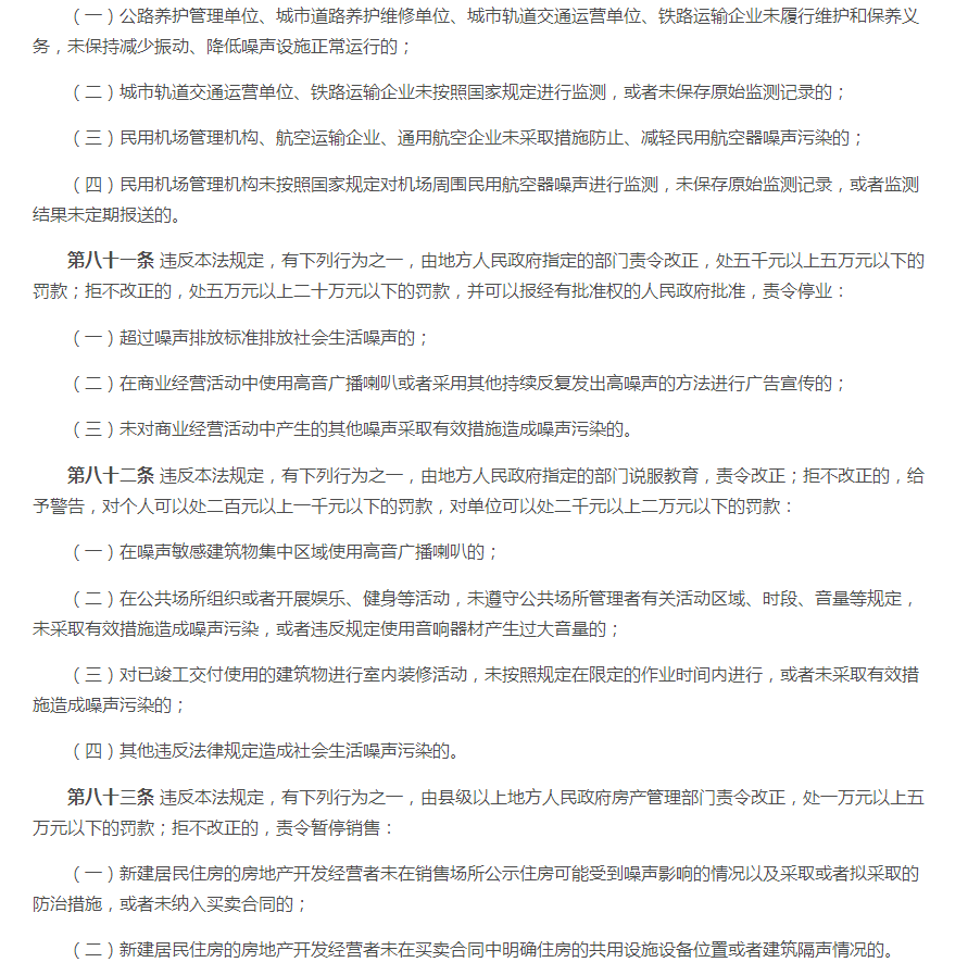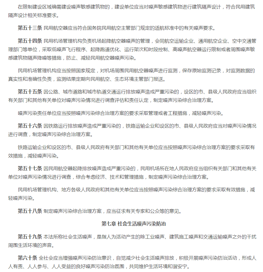 一、2021版《中华人民共和国噪音污染防治法》 原有法规的第十五条至第十七条、第十九至第二十条、第二十三条至第二十四条、第二十六条、第二十八至第二十九条等内容。 二、2021版《中华人民共和国噪音污染防治法》 (一)新版对第一条至第五条略微调整噪声音排放及防范措施标准。对噪声源头管控、分类管理、社会共治、损害担责的原则。将噪音污染防护纳入工作经费及本级政府预算。 (二)新版对第六条至第十条调整了噪音污染的考核标准。相关单位对噪声污染应实施统一监督管理。有关部门做好噪音污染的防治教育普及工作。 (三)新版对第十一至第十五条新增调整了国家鼓励对噪音防治人才及专业的培养,促进行业技术发展。对于在防治噪音实际工作中有明显成绩的单位及个人将给予表彰、奖励。各部门要做好噪音体系建设,各部门之间要做好衔接工作。 (四)新版法规第十六条至第十八条中有明确说明,对噪音限值还规定到要将相关数据写入技术文件注明。 (五)新增法规中的第二十条至第二十四条、第二十六条中对于当地政府在噪音防治工作上要及时编制声环境质量报告改善规划并实施方案,并将方案向社会公开。当地政府要加强敏感建筑物周边环境噪音排放情况的调查、监测工作。要对新建、扩建、改建可能污染环境的项目进行环境影响评价。 (六)新增法规条款第二十八条、第三十条至第三十条中,明确到对于群众反映的噪声污染问题,政府生态部门要对相关责任人进行约谈,并采取有效措施进行整改,并应向社会进行公布。 (七)新增及调整对第七十一条至第八十七条中的处罚规则。 (八)新增法规中第八十八条至第八十九条对于噪音列用含义的调整。